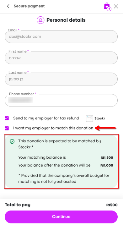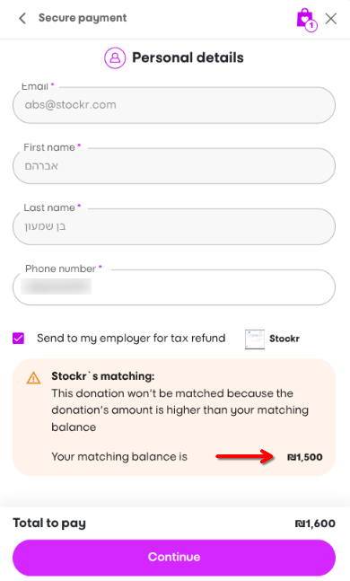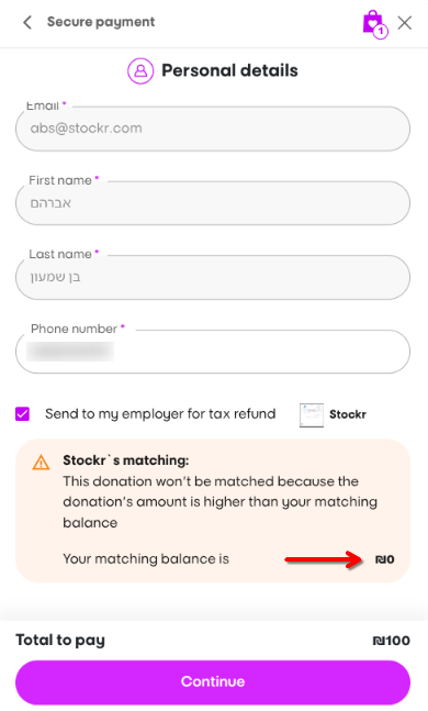 - If the company-wide maximum matching budget is fully used, the donation matching option will not appear during the donation process