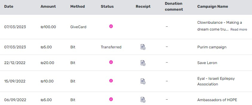 In the lower part of the dashboard, you can view your donation history by filtering dates and download their receipts.
