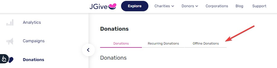 On the donations page, you will find three tabs at the top of the page. Click on 'Offline Donations.