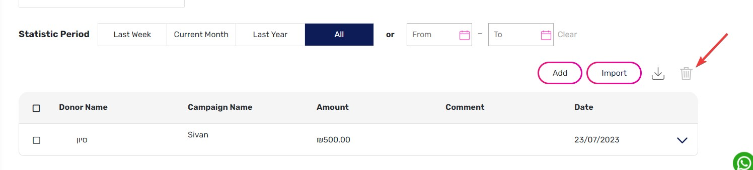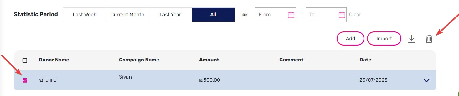 - To delete multiple donations, mark the desired donations using the checkboxes on the left side of the table. Then, click on the trash can icon located above the right side of the table.