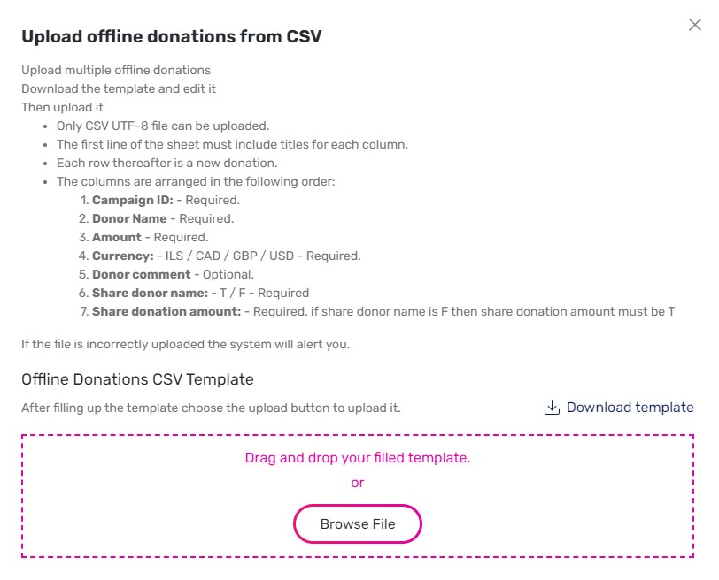 You must upload a CSV UTF-8 file following the instructions displayed in the window that opens when clicking on the 'Browse File' button at the bottom of the window. Once selected, the file will be uploaded, and donations will be automatically updated without the need for additional confirmation