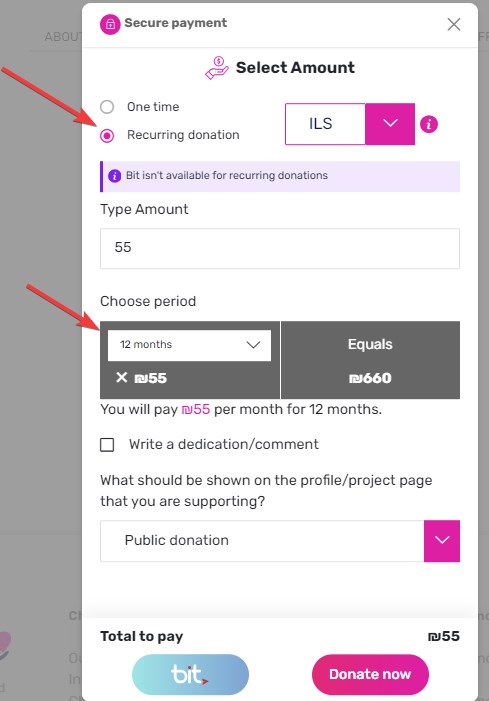 Click on "Donate". At this stage, define the type of donation as "Recurring donation" and define the number of months that the standing order will be active: